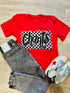 Get your chant on with this playful and eye-catching graphic tee! Featuring a checkered design and bold black glitter letters, this tee will add some fun to your wardrobe. Perfect for casual outings or cheering on your favorite team. Now that's something to chant about!