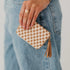 Wynona's got style in every stitch! This charming woven wallet features a classic checkered pattern in warm tan tones that pairs perfectly with any outfit. Compact yet spacious, it keeps your cards and cash organized without the bulk. The durable woven construction means it'll handle daily adventures with ease, while the timeless design ensures you'll love carrying it season after season. A little wallet with major personality.